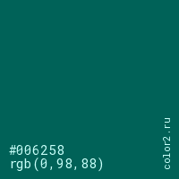 Цвет #006258 в цветовой модели RGB обозначается тремя октетами (0, 98, 88) в десятичном формате и #006258 в шестнадцатиричном (hex) формате, которые являются интенсивностью красного 0 (hex 00), интенсивность зелёного 98 (hex 62) и интенсивность синего 88 (hex 58).