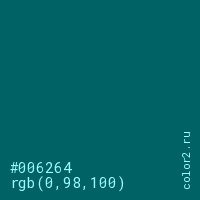 Цвет #006264 в цветовой модели RGB обозначается тремя октетами (0, 98, 100) в десятичном формате и #006264 в шестнадцатиричном (hex) формате, которые являются интенсивностью красного 0 (hex 00), интенсивность зелёного 98 (hex 62) и интенсивность синего 100 (hex 64).