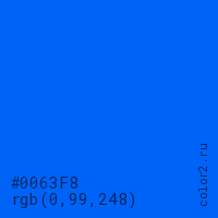 Цвет #0063F8 в цветовой модели RGB обозначается тремя октетами (0, 99, 248) в десятичном формате и #0063F8 в шестнадцатиричном (hex) формате, которые являются интенсивностью красного 0 (hex 00), интенсивность зелёного 99 (hex 63) и интенсивность синего 248 (hex F8).