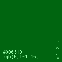 Цвет #006510 в цветовой модели RGB обозначается тремя октетами (0, 101, 16) в десятичном формате и #006510 в шестнадцатиричном (hex) формате, которые являются интенсивностью красного 0 (hex 00), интенсивность зелёного 101 (hex 65) и интенсивность синего 16 (hex 10).