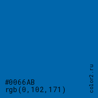 Цвет #0066AB в цветовой модели RGB обозначается тремя октетами (0, 102, 171) в десятичном формате и #0066AB в шестнадцатиричном (hex) формате, которые являются интенсивностью красного 0 (hex 00), интенсивность зелёного 102 (hex 66) и интенсивность синего 171 (hex AB).