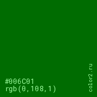 Цвет #006C01 в цветовой модели RGB обозначается тремя октетами (0, 108, 1) в десятичном формате и #006C01 в шестнадцатиричном (hex) формате, которые являются интенсивностью красного 0 (hex 00), интенсивность зелёного 108 (hex 6C) и интенсивность синего 1 (hex 01).