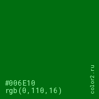 Цвет #006E10 в цветовой модели RGB обозначается тремя октетами (0, 110, 16) в десятичном формате и #006E10 в шестнадцатиричном (hex) формате, которые являются интенсивностью красного 0 (hex 00), интенсивность зелёного 110 (hex 6E) и интенсивность синего 16 (hex 10).
