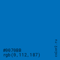 Цвет RGB(0, 112, 187) в процентом отношении количества цвета состоит из 0% красного (red), 43.9% зелёного (green) и 73.3% синего (blue).