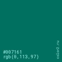 Цвет #007161 в цветовой модели RGB обозначается тремя октетами (0, 113, 97) в десятичном формате и #007161 в шестнадцатиричном (hex) формате, которые являются интенсивностью красного 0 (hex 00), интенсивность зелёного 113 (hex 71) и интенсивность синего 97 (hex 61).