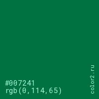 Цвет #007241 в цветовой модели RGB обозначается тремя октетами (0, 114, 65) в десятичном формате и #007241 в шестнадцатиричном (hex) формате, которые являются интенсивностью красного 0 (hex 00), интенсивность зелёного 114 (hex 72) и интенсивность синего 65 (hex 41).