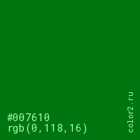 Цвет #007610 в цветовой модели RGB обозначается тремя октетами (0, 118, 16) в десятичном формате и #007610 в шестнадцатиричном (hex) формате, которые являются интенсивностью красного 0 (hex 00), интенсивность зелёного 118 (hex 76) и интенсивность синего 16 (hex 10).
