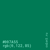 Цвет #007A55 в цветовой модели RGB обозначается тремя октетами (0, 122, 85) в десятичном формате и #007A55 в шестнадцатиричном (hex) формате, которые являются интенсивностью красного 0 (hex 00), интенсивность зелёного 122 (hex 7A) и интенсивность синего 85 (hex 55).