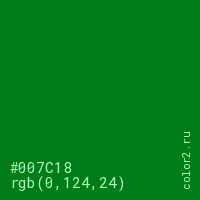 Цвет #007C18 в цветовой модели RGB обозначается тремя октетами (0, 124, 24) в десятичном формате и #007C18 в шестнадцатиричном (hex) формате, которые являются интенсивностью красного 0 (hex 00), интенсивность зелёного 124 (hex 7C) и интенсивность синего 24 (hex 18).