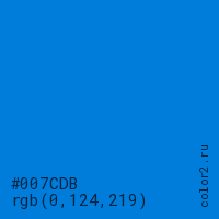 Цвет #007CDB в цветовой модели RGB обозначается тремя октетами (0, 124, 219) в десятичном формате и #007CDB в шестнадцатиричном (hex) формате, которые являются интенсивностью красного 0 (hex 00), интенсивность зелёного 124 (hex 7C) и интенсивность синего 219 (hex DB).