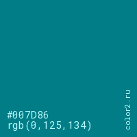 Цвет #007D86 в цветовой модели RGB обозначается тремя октетами (0, 125, 134) в десятичном формате и #007D86 в шестнадцатиричном (hex) формате, которые являются интенсивностью красного 0 (hex 00), интенсивность зелёного 125 (hex 7D) и интенсивность синего 134 (hex 86).