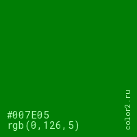 Цвет #007E05 в цветовой модели RGB обозначается тремя октетами (0, 126, 5) в десятичном формате и #007E05 в шестнадцатиричном (hex) формате, которые являются интенсивностью красного 0 (hex 00), интенсивность зелёного 126 (hex 7E) и интенсивность синего 5 (hex 05).