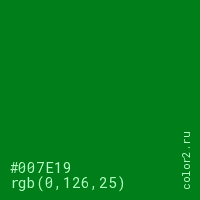 Цвет #007E19 в цветовой модели RGB обозначается тремя октетами (0, 126, 25) в десятичном формате и #007E19 в шестнадцатиричном (hex) формате, которые являются интенсивностью красного 0 (hex 00), интенсивность зелёного 126 (hex 7E) и интенсивность синего 25 (hex 19).