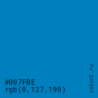 Цвет #007FBE в цветовой модели RGB обозначается тремя октетами (0, 127, 190) в десятичном формате и #007FBE в шестнадцатиричном (hex) формате, которые являются интенсивностью красного 0 (hex 00), интенсивность зелёного 127 (hex 7F) и интенсивность синего 190 (hex BE).