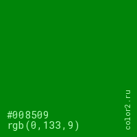 Цвет #008509 в цветовой модели RGB обозначается тремя октетами (0, 133, 9) в десятичном формате и #008509 в шестнадцатиричном (hex) формате, которые являются интенсивностью красного 0 (hex 00), интенсивность зелёного 133 (hex 85) и интенсивность синего 9 (hex 09).