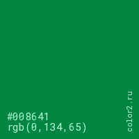 Цвет #008641 в цветовой модели RGB обозначается тремя октетами (0, 134, 65) в десятичном формате и #008641 в шестнадцатиричном (hex) формате, которые являются интенсивностью красного 0 (hex 00), интенсивность зелёного 134 (hex 86) и интенсивность синего 65 (hex 41).