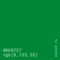 Цвет #008737 в цветовой модели RGB обозначается тремя октетами (0, 135, 55) в десятичном формате и #008737 в шестнадцатиричном (hex) формате, которые являются интенсивностью красного 0 (hex 00), интенсивность зелёного 135 (hex 87) и интенсивность синего 55 (hex 37).