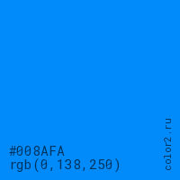 Цвет #008AFA в цветовой модели RGB обозначается тремя октетами (0, 138, 250) в десятичном формате и #008AFA в шестнадцатиричном (hex) формате, которые являются интенсивностью красного 0 (hex 00), интенсивность зелёного 138 (hex 8A) и интенсивность синего 250 (hex FA).