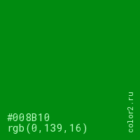 Цвет #008B10 в цветовой модели RGB обозначается тремя октетами (0, 139, 16) в десятичном формате и #008B10 в шестнадцатиричном (hex) формате, которые являются интенсивностью красного 0 (hex 00), интенсивность зелёного 139 (hex 8B) и интенсивность синего 16 (hex 10).
