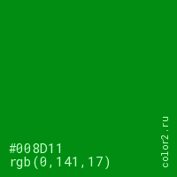 Цвет #008D11 в цветовой модели RGB обозначается тремя октетами (0, 141, 17) в десятичном формате и #008D11 в шестнадцатиричном (hex) формате, которые являются интенсивностью красного 0 (hex 00), интенсивность зелёного 141 (hex 8D) и интенсивность синего 17 (hex 11).