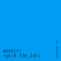 Цвет #009CF1 в цветовой модели RGB обозначается тремя октетами (0, 156, 241) в десятичном формате и #009CF1 в шестнадцатиричном (hex) формате, которые являются интенсивностью красного 0 (hex 00), интенсивность зелёного 156 (hex 9C) и интенсивность синего 241 (hex F1).