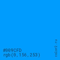 Цвет RGB(0, 156, 253) в процентом отношении количества цвета состоит из 0% красного (red), 61.2% зелёного (green) и 99.2% синего (blue).