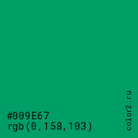 Цвет #009E67 в цветовой модели RGB обозначается тремя октетами (0, 158, 103) в десятичном формате и #009E67 в шестнадцатиричном (hex) формате, которые являются интенсивностью красного 0 (hex 00), интенсивность зелёного 158 (hex 9E) и интенсивность синего 103 (hex 67).