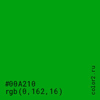 Цвет #00A210 в цветовой модели RGB обозначается тремя октетами (0, 162, 16) в десятичном формате и #00A210 в шестнадцатиричном (hex) формате, которые являются интенсивностью красного 0 (hex 00), интенсивность зелёного 162 (hex A2) и интенсивность синего 16 (hex 10).