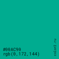 Цвет #00AC90 в цветовой модели RGB обозначается тремя октетами (0, 172, 144) в десятичном формате и #00AC90 в шестнадцатиричном (hex) формате, которые являются интенсивностью красного 0 (hex 00), интенсивность зелёного 172 (hex AC) и интенсивность синего 144 (hex 90).