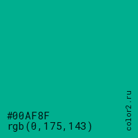 Цвет #00AF8F в цветовой модели RGB обозначается тремя октетами (0, 175, 143) в десятичном формате и #00AF8F в шестнадцатиричном (hex) формате, которые являются интенсивностью красного 0 (hex 00), интенсивность зелёного 175 (hex AF) и интенсивность синего 143 (hex 8F).