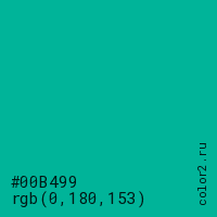 Цвет #00B499 в цветовой модели RGB обозначается тремя октетами (0, 180, 153) в десятичном формате и #00B499 в шестнадцатиричном (hex) формате, которые являются интенсивностью красного 0 (hex 00), интенсивность зелёного 180 (hex B4) и интенсивность синего 153 (hex 99).