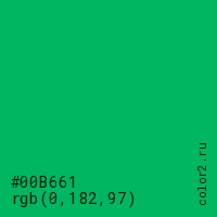 Цвет #00B661 в цветовой модели RGB обозначается тремя октетами (0, 182, 97) в десятичном формате и #00B661 в шестнадцатиричном (hex) формате, которые являются интенсивностью красного 0 (hex 00), интенсивность зелёного 182 (hex B6) и интенсивность синего 97 (hex 61).