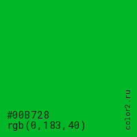 Цвет #00B728 в цветовой модели RGB обозначается тремя октетами (0, 183, 40) в десятичном формате и #00B728 в шестнадцатиричном (hex) формате, которые являются интенсивностью красного 0 (hex 00), интенсивность зелёного 183 (hex B7) и интенсивность синего 40 (hex 28).
