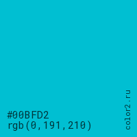 Цвет #00BFD2 в цветовой модели RGB обозначается тремя октетами (0, 191, 210) в десятичном формате и #00BFD2 в шестнадцатиричном (hex) формате, которые являются интенсивностью красного 0 (hex 00), интенсивность зелёного 191 (hex BF) и интенсивность синего 210 (hex D2).