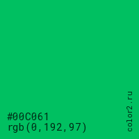 Цвет #00C061 в цветовой модели RGB обозначается тремя октетами (0, 192, 97) в десятичном формате и #00C061 в шестнадцатиричном (hex) формате, которые являются интенсивностью красного 0 (hex 00), интенсивность зелёного 192 (hex C0) и интенсивность синего 97 (hex 61).