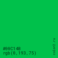 Цвет #00C14B в цветовой модели RGB обозначается тремя октетами (0, 193, 75) в десятичном формате и #00C14B в шестнадцатиричном (hex) формате, которые являются интенсивностью красного 0 (hex 00), интенсивность зелёного 193 (hex C1) и интенсивность синего 75 (hex 4B).