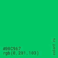 Цвет #00C967 в цветовой модели RGB обозначается тремя октетами (0, 201, 103) в десятичном формате и #00C967 в шестнадцатиричном (hex) формате, которые являются интенсивностью красного 0 (hex 00), интенсивность зелёного 201 (hex C9) и интенсивность синего 103 (hex 67).