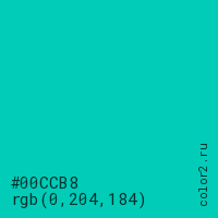 Цвет #00CCB8 в цветовой модели RGB обозначается тремя октетами (0, 204, 184) в десятичном формате и #00CCB8 в шестнадцатиричном (hex) формате, которые являются интенсивностью красного 0 (hex 00), интенсивность зелёного 204 (hex CC) и интенсивность синего 184 (hex B8).