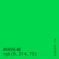 Цвет #00D64B в цветовой модели RGB обозначается тремя октетами (0, 214, 75) в десятичном формате и #00D64B в шестнадцатиричном (hex) формате, которые являются интенсивностью красного 0 (hex 00), интенсивность зелёного 214 (hex D6) и интенсивность синего 75 (hex 4B).