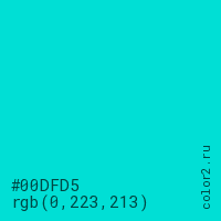 Цвет #00DFD5 в цветовой модели RGB обозначается тремя октетами (0, 223, 213) в десятичном формате и #00DFD5 в шестнадцатиричном (hex) формате, которые являются интенсивностью красного 0 (hex 00), интенсивность зелёного 223 (hex DF) и интенсивность синего 213 (hex D5).
