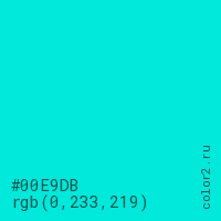 Цвет #00E9DB в цветовой модели RGB обозначается тремя октетами (0, 233, 219) в десятичном формате и #00E9DB в шестнадцатиричном (hex) формате, которые являются интенсивностью красного 0 (hex 00), интенсивность зелёного 233 (hex E9) и интенсивность синего 219 (hex DB).