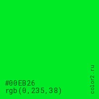 Цвет #00EB26 в цветовой модели RGB обозначается тремя октетами (0, 235, 38) в десятичном формате и #00EB26 в шестнадцатиричном (hex) формате, которые являются интенсивностью красного 0 (hex 00), интенсивность зелёного 235 (hex EB) и интенсивность синего 38 (hex 26).