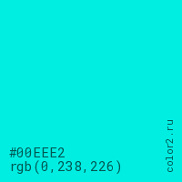 Цвет #00EEE2 в цветовой модели RGB обозначается тремя октетами (0, 238, 226) в десятичном формате и #00EEE2 в шестнадцатиричном (hex) формате, которые являются интенсивностью красного 0 (hex 00), интенсивность зелёного 238 (hex EE) и интенсивность синего 226 (hex E2).
