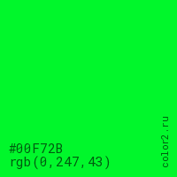 Цвет #00F72B в цветовой модели RGB обозначается тремя октетами (0, 247, 43) в десятичном формате и #00F72B в шестнадцатиричном (hex) формате, которые являются интенсивностью красного 0 (hex 00), интенсивность зелёного 247 (hex F7) и интенсивность синего 43 (hex 2B).
