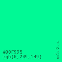 Цвет #00F995 в цветовой модели RGB обозначается тремя октетами (0, 249, 149) в десятичном формате и #00F995 в шестнадцатиричном (hex) формате, которые являются интенсивностью красного 0 (hex 00), интенсивность зелёного 249 (hex F9) и интенсивность синего 149 (hex 95).