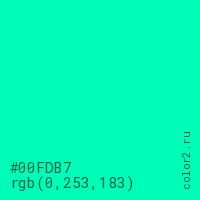 Цвет #00FDB7 в цветовой модели RGB обозначается тремя октетами (0, 253, 183) в десятичном формате и #00FDB7 в шестнадцатиричном (hex) формате, которые являются интенсивностью красного 0 (hex 00), интенсивность зелёного 253 (hex FD) и интенсивность синего 183 (hex B7).