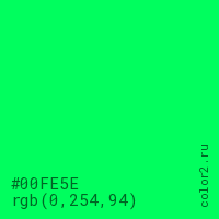 Цвет #00FE5E в цветовой модели RGB обозначается тремя октетами (0, 254, 94) в десятичном формате и #00FE5E в шестнадцатиричном (hex) формате, которые являются интенсивностью красного 0 (hex 00), интенсивность зелёного 254 (hex FE) и интенсивность синего 94 (hex 5E).