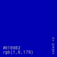 Цвет #0100B2 в цветовой модели RGB обозначается тремя октетами (1, 0, 178) в десятичном формате и #0100B2 в шестнадцатиричном (hex) формате, которые являются интенсивностью красного 1 (hex 01), интенсивность зелёного 0 (hex 00) и интенсивность синего 178 (hex B2).