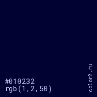Цвет #010232 в цветовой модели RGB обозначается тремя октетами (1, 2, 50) в десятичном формате и #010232 в шестнадцатиричном (hex) формате, которые являются интенсивностью красного 1 (hex 01), интенсивность зелёного 2 (hex 02) и интенсивность синего 50 (hex 32).