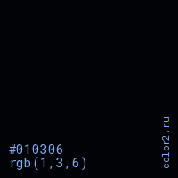 Цвет #010306 в цветовой модели RGB обозначается тремя октетами (1, 3, 6) в десятичном формате и #010306 в шестнадцатиричном (hex) формате, которые являются интенсивностью красного 1 (hex 01), интенсивность зелёного 3 (hex 03) и интенсивность синего 6 (hex 06).